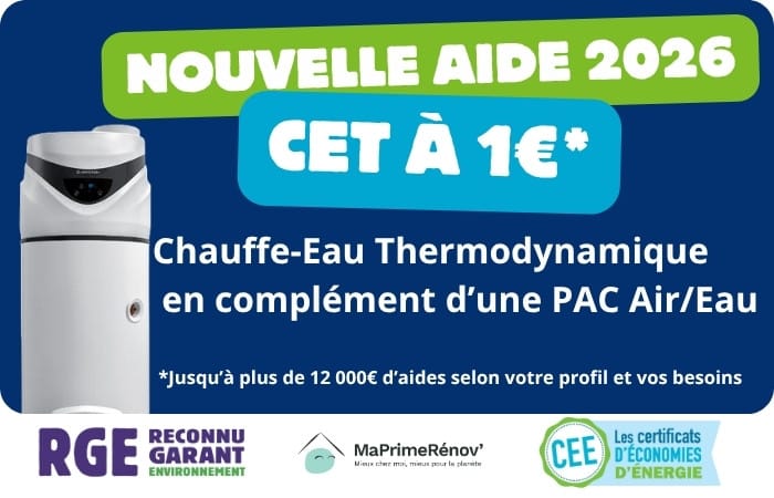 Élaboré pour économiser l’énergie, le chauffe-eau thermodynamique, également appelé ballon thermodynamique, est un cumulus « classique » doté d’une pompe à chaleur au lieu et place d’une résistance thermique, de ce fait le CET utilise l’énergie électrique mais également les calories de l’air et permet de réaliser jusqu’à 60 % d’économies en comparaison à un système de chauffe-eau classique.